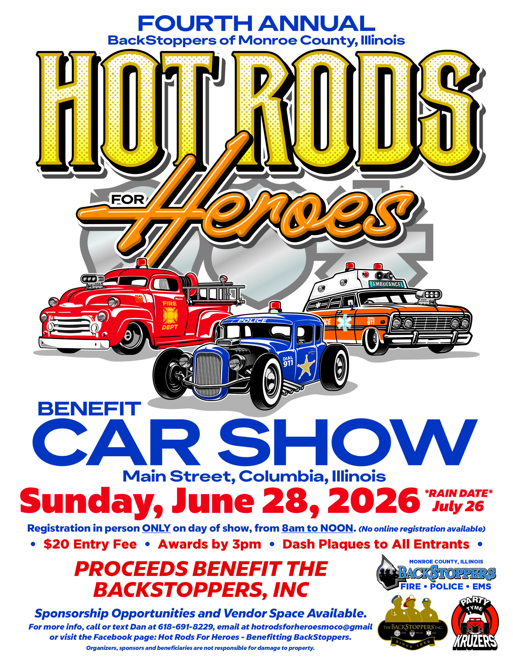 The BackStoppers of Monroe County, IL 4th Annual Hot Rods for Heroes will be held on Sunday, June 28th at Main Street Columbia, IL.